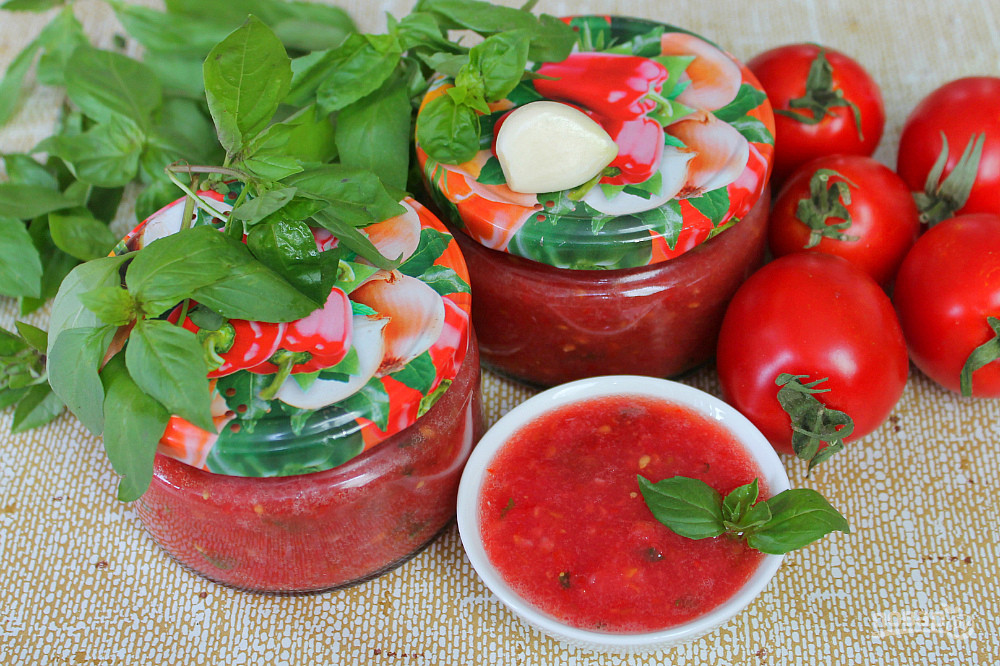 Приготовление: Измельчи помидоры в блендере, выдави чеснок и очень мелко наруби базилик. Смешай все ингредиенты, приправь по вкусу и закатай в банки.
