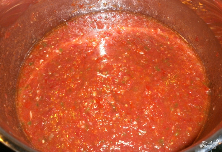 - Чеснок, помидоры и острый перец пропустить через мясорубку. В овощное пюре всыпать молотые специи, сахар и соль. Все тщательно перемешать и кипятить на слабом огне около 4 часов.
