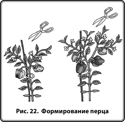 При выращивании перца в открытом грунте формированию подлежат только высокорослые сорта и гибриды. У среднерослых удалению подлежат бесплодные жирующие побеги, нижние побеги и пасынки, чтобы обеспечить кусту нормальное освещение и проветривание. Низкорослые сорта перца не нуждаются в формировании. Подлежат удалению кривые, обломанные, растущие внутрь побеги. На средне– и низкорослых кустах перца для усиления бокового ветвления проводят прищипывание центральных побегов. Общее число плодоносных побегов перца не превышает 4-6, а количество плодов в зависимости от сорта — 15-25.