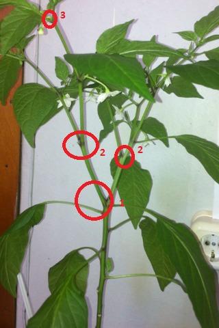 Он считается скелетным и должен иметь силу поддерживать остальные, расположенные выше, побеги. На нем оставляют листья, бутоны или цветки/плоды. Второй побег второго порядка перца, как правило, слабее. Его прищипывают, оставляя плод и лист.