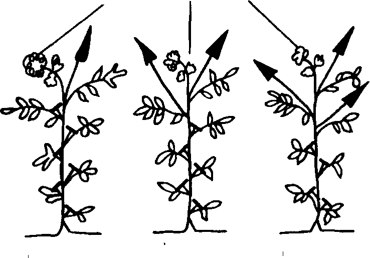 Веточки перца, образовавшиеся после разветвления, называют боковыми. Это ветки первого порядка, или скелетные. Каждая боковая ветка вначале растет центральным стеблем, на котором есть листья. У основания черешков этих листьев (в пазухе) появляются побеги. Это пасынки. Их удаляют прищипыванием.
