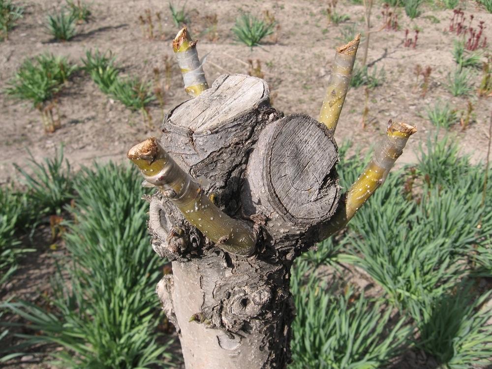 - Обрезают привитый черенок, оставив 2—3 почки. Смазывают место среза садовым варом.
