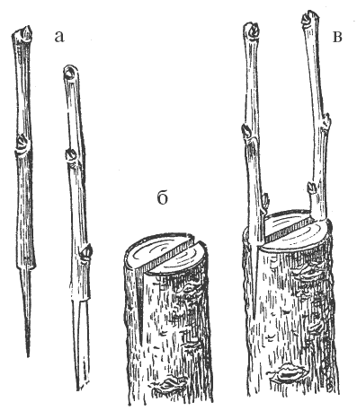 - Нижний конец черенка обрезают, придавая ему клиновидную форму. Вставляют в расщеп, не забывая совмещать камбиальные слои, и вынимают клин. В результате черенок оказывается плотно зажатым в расщепе.В случае большого диаметра подвоя в расщеп можно привить несколько черенков