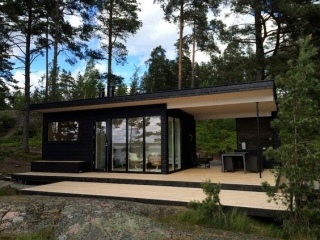 Одноэтажный дом успешно совмещает в себе функционал жилого помещения и бани: здесь имеется просторная гостиная (11 м²) с кухней и зоной отдыха, отдельный санузел, моечная (3,7 м²). Проектом предусмотрено наличие тамбура и открытой террасы.