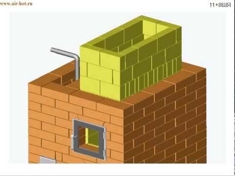 - С двадцать третьего ряда начинают монтаж дымохода, который определяет высоту всей конструкции.