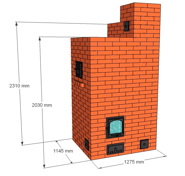 Примерные габариты печки: Высота около 0,4 — 0,6 м; Ширина около 0,5 — 0,75 м; Длина около 0,75 — 1 м.