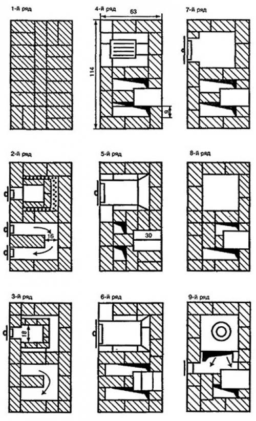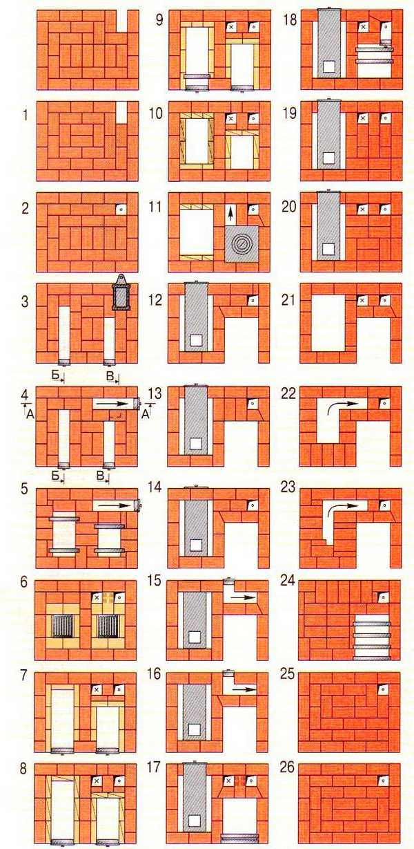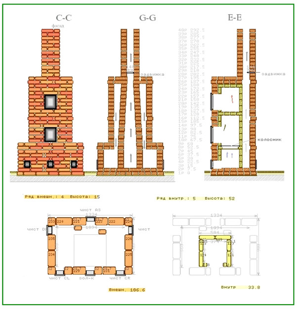 Очень редко можно найти готовый проект кирпичной печи, который устраивает на 100%. Приходится дорабатывать и переделывать готовую порядовку. В этом случае вносите необходимые коррективы, детально прорисовывая каждый ряд кирпичей, и исправленную порядовку показываете специалисту.