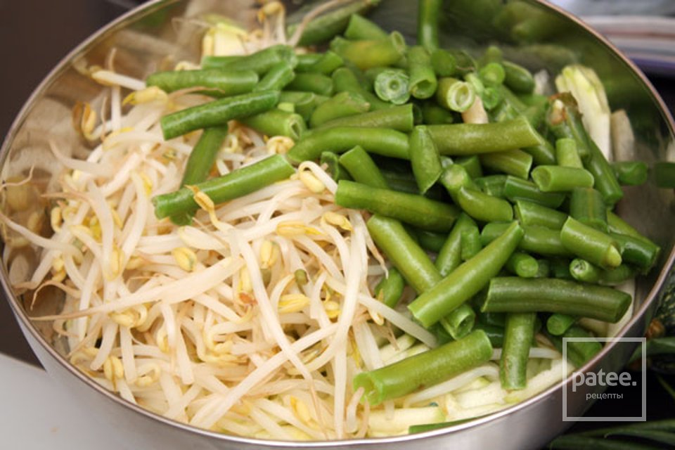 Бланшировать ростки фасоли в кипящей воде в течение 1 минуты и процедить.