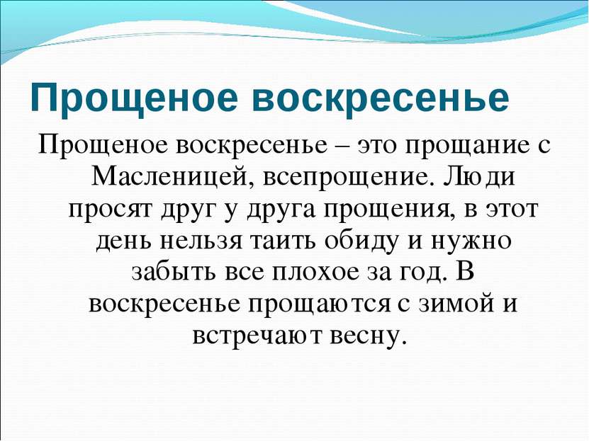 Прощенное воскресеньеРусские обычаи- В праздник Прощенное воскресенье принято посещать родные могилы, заказывать поминание за усопших на Литургии и панихиде.