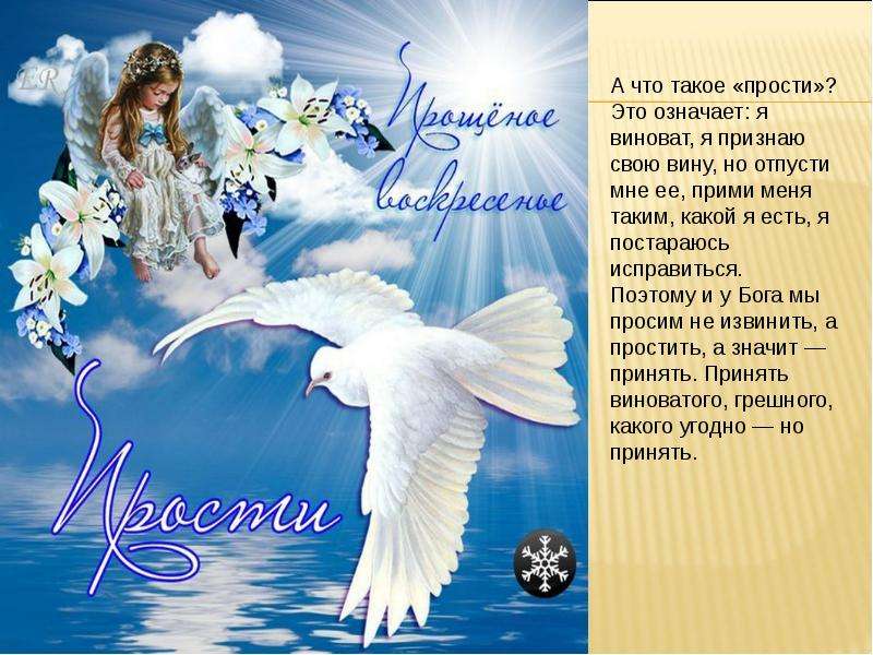 Бог готов и желает прощать грешников, но мы, грешники, должны быть готовы и желаем получить прощение. Чтобы постное путешествие имело какое-либо влияние, мы должны быть открыты для прощения; Если мы не можем прощать других, признавать свои ошибки и быть прощенными теми, кого мы обидели, внутри нас нет места для милости Божьей. Отец Александр Шмеманн в своей книге «Великий пост : Путешествие к Пасхе » пишет: «Торжество греха, главный признак его господства над словом — это разделение, противостояние, разделение, ненависть.Поэтому первый прорыв через эту крепость греха — прощение: возвращение к единству, солидарности, любви. Прощать — значит поставить между мной и моим «врагом» сияющее прощение Самого Бога. . . . Прощение — это поистине «прорыв» Царства в это греховное и падшее слово ». Божье прощение дается нам через других, а не в одиночку; таким образом, именно через взаимное прощение мы действительно начинаем путь к Воскресению.