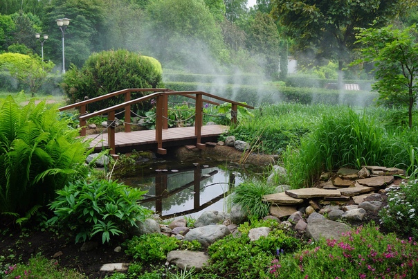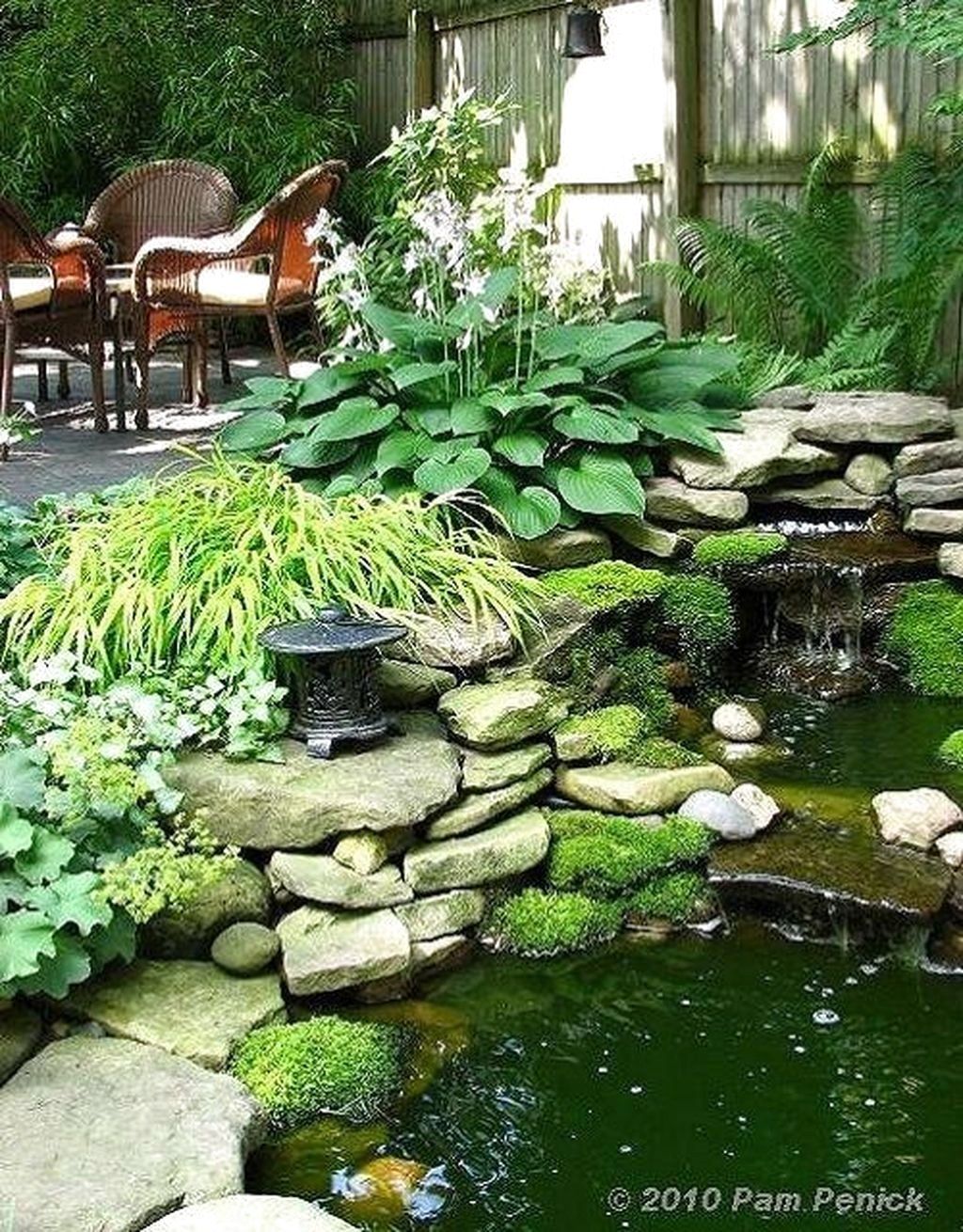 Небольшой, но глубокий пруд с традиционными японскими кленами, папоротниками и злаками, растущими прямо у кромки воды, подойдет для уголка сада в японском стиле. Аутентичность пейзажу придают карпы кои, плавающие живописными стайками, декоративный каменный фонарь, статуя цапли.