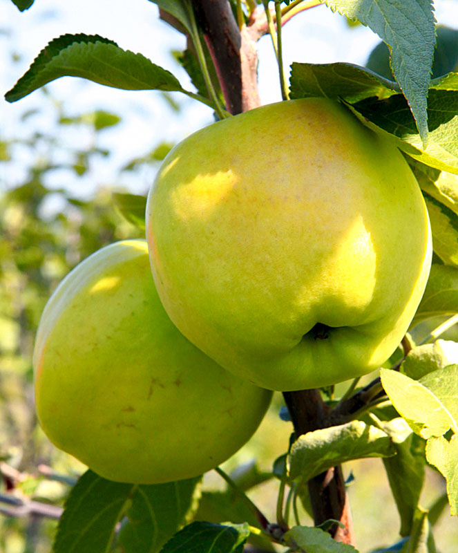 Красивые, правильной круглой формы яблони, с наливным цветом. Общий цвет желтый, под воздействием ультрафиолетовых лучей проявляется румянец, который может распространяться на весь плод, делая его почти красным.