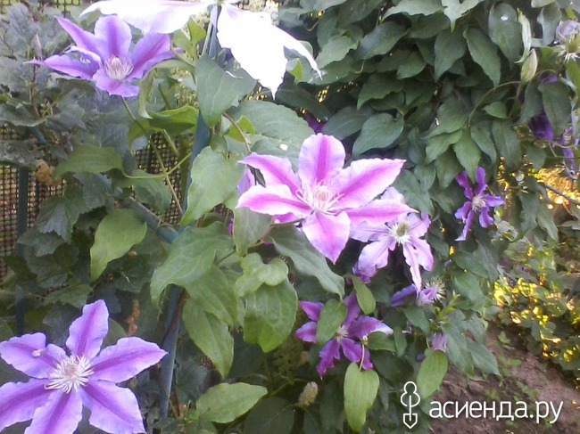 Принц Чарльз. Лиана вырастает до 2 м. Цветки от нежно-фиолетового до голубого цвета. Диаметр – до 13 см. Пыльник кремовый. Лиана прекрасно уживается с другими растениями. Желательно высаживать ее возле невысоких оградок и опор, но можно и как почвопокровник.