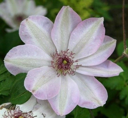 Рассвет. Интересный вид клематиса Витицелла. Цветы крупные, с нежно-розовыми лепестками, которые выгорают до белого на солнце. Пыльник кремовый. Цветет с мая по август на побегах текущего года.