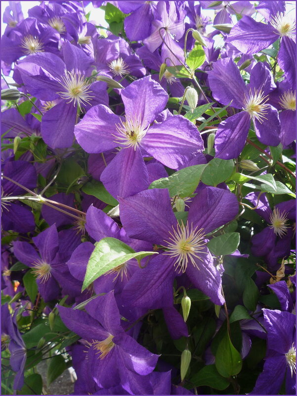 Яркими, удивительно нежными и трогательными цветками клематиса украшали ограды, деревья, стены и арки.