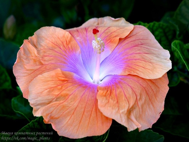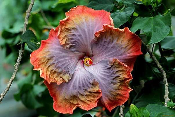 - Hibiscus sinensis «Magic Moment» имеет 10-дюймовые цветы персикового, оранжевого, розового и светло-фиолетового цветов на растениях, достигающих 8 футов в высоту.