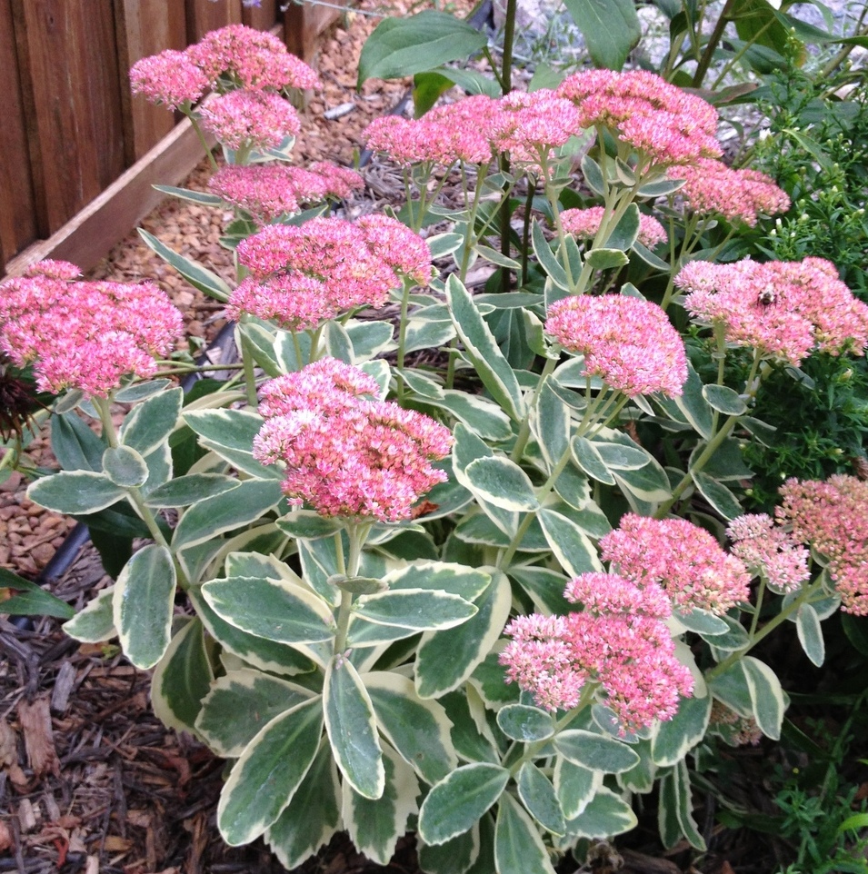 Обратите внимание на фото – у этого очитка к осени на вершинах побегов формируются крупные щитковидные соцветия из мелких розовых цветков-звездочек: