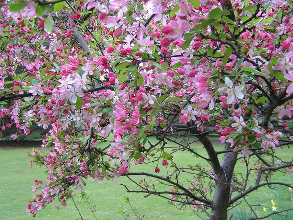 - Плакучие. Невероятно красивые декоративные растения. Весной плакучие яблони буквально усыпаны нежными розовыми цветочками. Летом красива пурпурная листва. А осенью, помимо эффектной краснеющей листвы, яблоня демонстрирует ветви, свисающие под тяжестью мелких плодов, которые могут стать отличной зимней кормушкой для птиц.