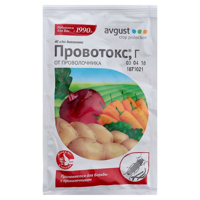 Проникает в стебли и листья растений, в плодах не накапливается. При опрыскивании сохраняет действие до 4-х недель, при внесении в почву – до 6-ти недель. Препарат выпускается в гранулах. Раствор для полива готовят в пропорции 4 г гранул на 10 л воды. Опрыскивание делают, растворяя 1,2 г препарата в 10 л воды. - «Провотокс» — ещё один препарат на основе диазонина. Так же производится в гранулах (пакеты по 40/120 г). Вносят по 2-4 гранулы в ямку перед посадкой. Упаковки в 40 г достаточно для 10 м2 . При температуре выше 250 градусов препарат не используют. Рекомендуют работать с препаратом утром или вечером, в сухую безветренную погоду.