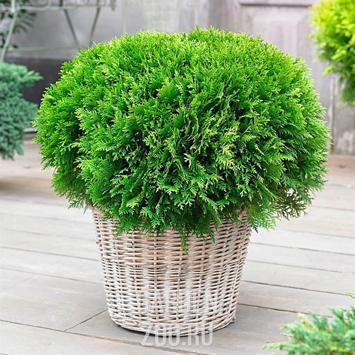 Туя западная «Globosa Nana» имеет компактную шаровидную крону, достигает высоты до 0,3 м. Предпочитает полутень, очень плохо переносит сухость воздуха, любит обильный полив и отзывчива на дождевание кроны.