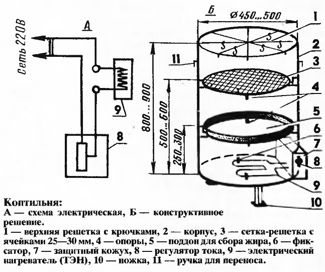 камера для дачи, конструкция для копчения колбасы, сала, размеры печи, как выбрать круглое устройство и смокер, стационарная коптильня