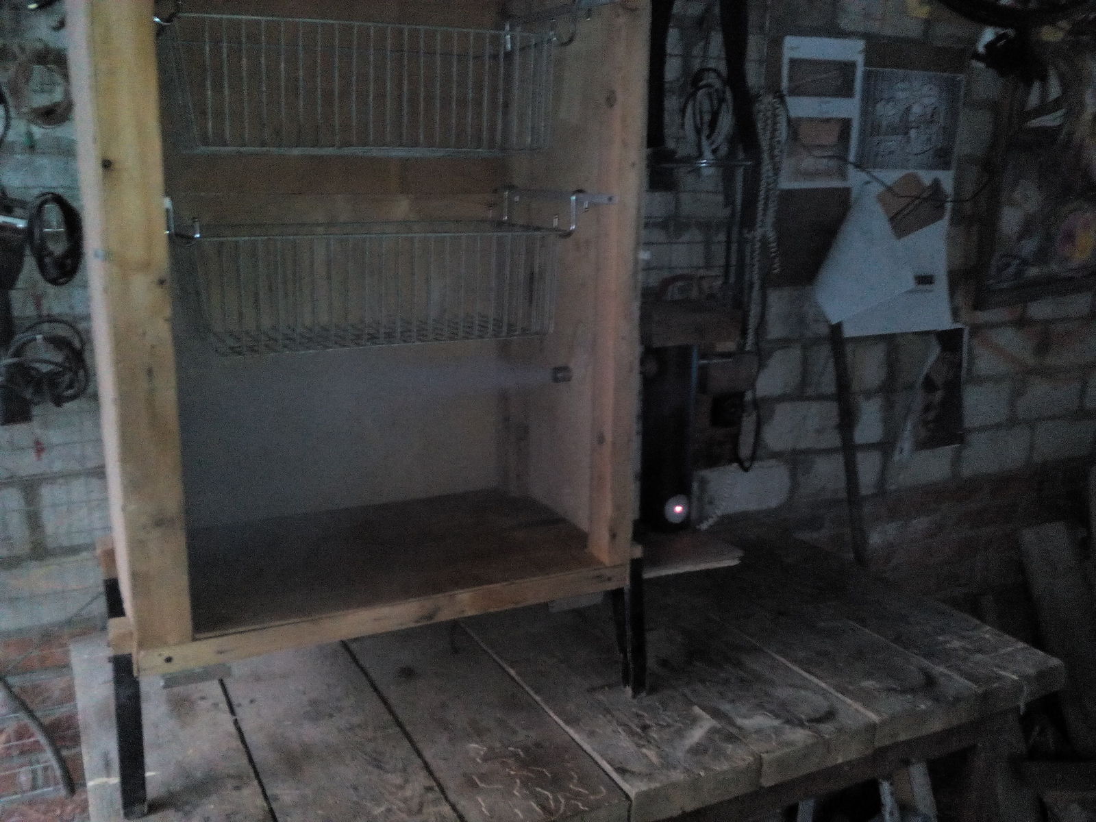 - В стенках необходимо сделать четыре отверстия на одном уровне на высоте примерно 20 см от дна для поддона. На этой высоте будут устанавливаться решетки или подвешиваться крюки с будущими копченостями.
