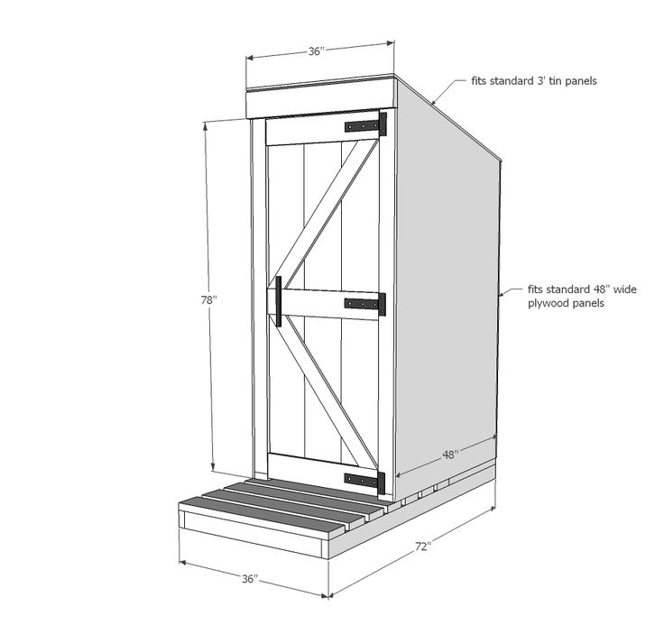 Эта туалетная кабинка имеет вид треугольника. Боковые стенки одновременно являются скатом кровли. Построить такой туалет своими руками можно за несколько часов. Чертежи с примерными размерами даны на картинке ниже. В них можно и нужно вносить корректировки: все габариты даны для людей средней комплекции.