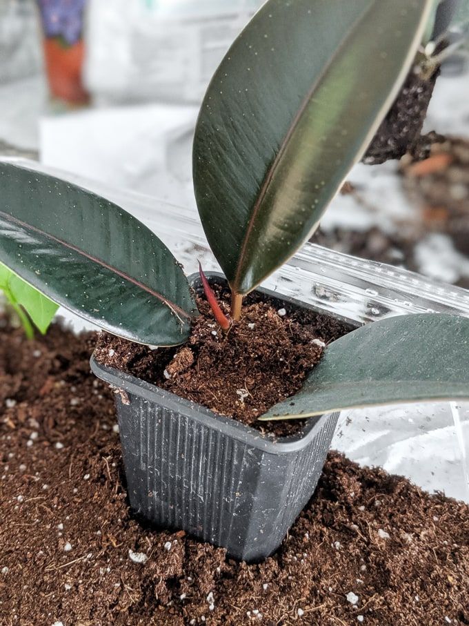 Каучуконосным растениям для прорастания корней требуется влажная среда, поэтому наденьте на каждый горшок пакет с застежкой-молнией, чтобы создать тепличную среду.