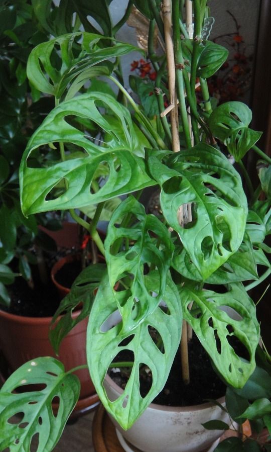 Monstera Deliciosa — наиболее распространенная разновидность монстеры, которая в настоящее время используется в качестве комнатных растений.Они могут вырасти до 8 футов в помещении, предпочитая иметь какую-то конструкцию, по которой можно забраться, и известны своими огромными листьями. У хорошо зарекомендовавшего себя Monstera deliciosa листья растения могут достигать 3 футов в ширину и заполнены фенестрациями.