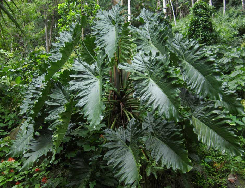 Родиной являются жаркие и влажные тропики Американского континента. Форма листовых пластин слегка удлиненная, яйцевидная, длина каждой может достигать 80 см, а ширина не превышает 25-30 см. Кромка неровная, отверстия располагаются асимметрично, нижняя сторона заметно расширена.
