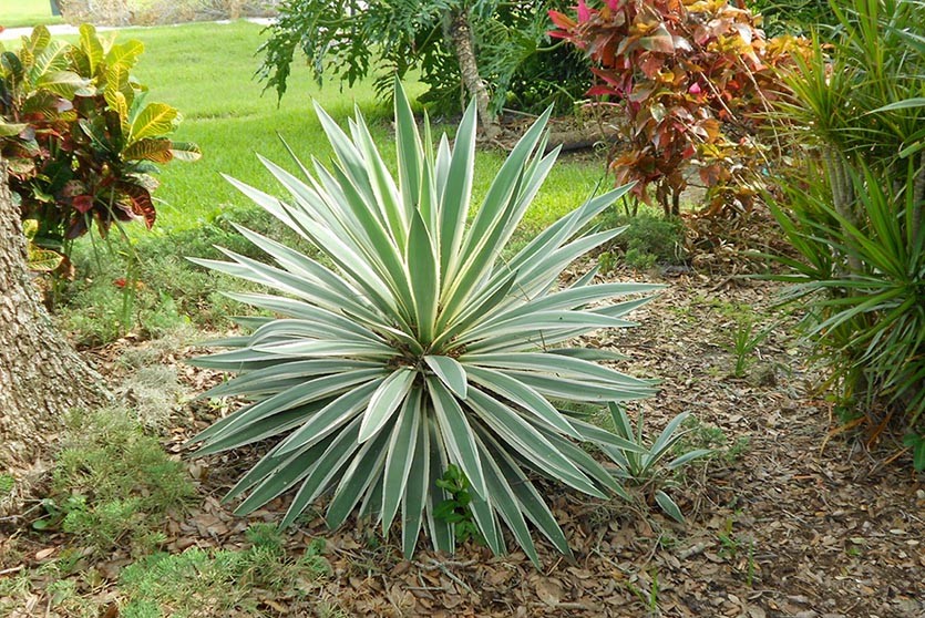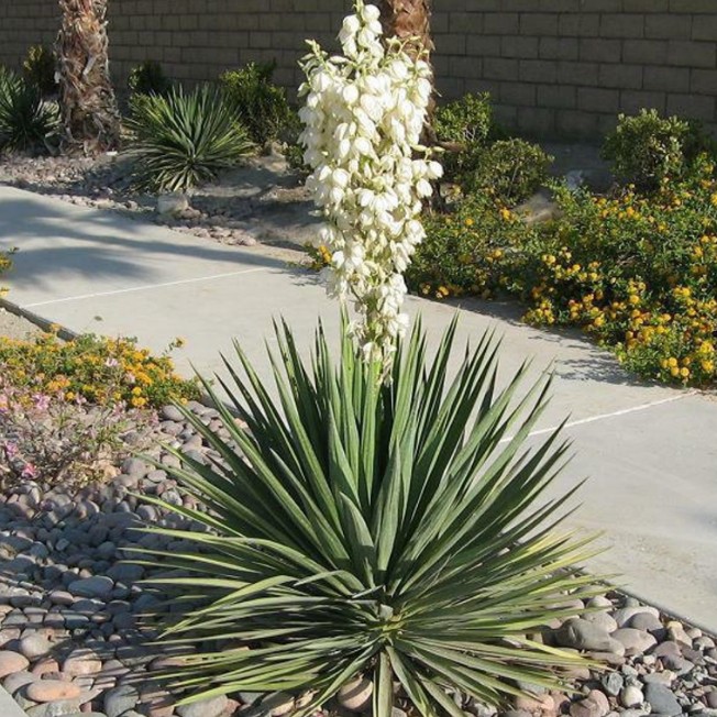 Как и некоторые юкки, она также имеет острые листья, но в отличие от них имеет зеленую крону с шипами и листву от желто-зеленого до сине-зеленого цвета. Его цветы также поразительны, бело-фиолетового цвета, стоящие на 4-футовом стебле.