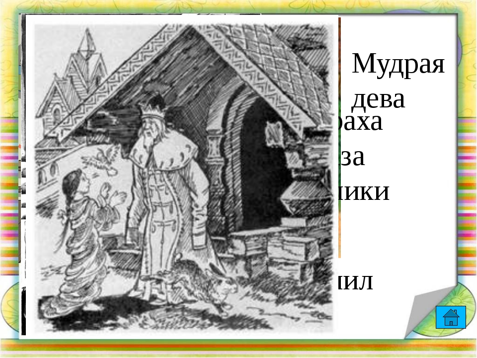 — Умная ж у тебя дочка — ничего не скажешь. А я всё же умнее её! Так вот передай ей, чтоб она не пешком пришла ко мне, не на лошади приехала, не голая, не одетая и принесла б мне подарок, да такой, чтоб я не мог принять его. Если она всё это сделает, то приму её в дочери — вырастет, паньею будет! А не сделает — плохо ей придётся…