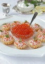 - Чтобы подать на стол, положите небольшое количество приготовленной крабовой смеси на каждый заварной крем, затем добавьте ложку икры.