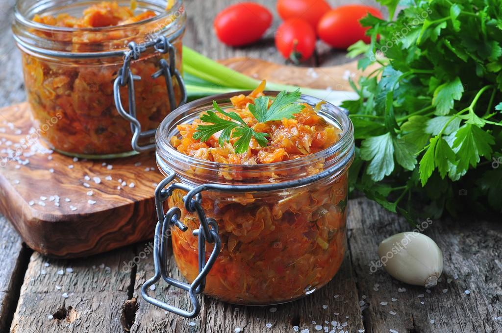 Овощную икру обычно готовят впрок и хранят всю зиму в банках.