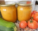 Кабачки (не молодые кабачки нужно очистить от кожуры и семян) и болгарский перец, очищенный от плодоножки и семян, пропустить через мясорубку и добавить в кастрюлю к перекрученным помидорам.