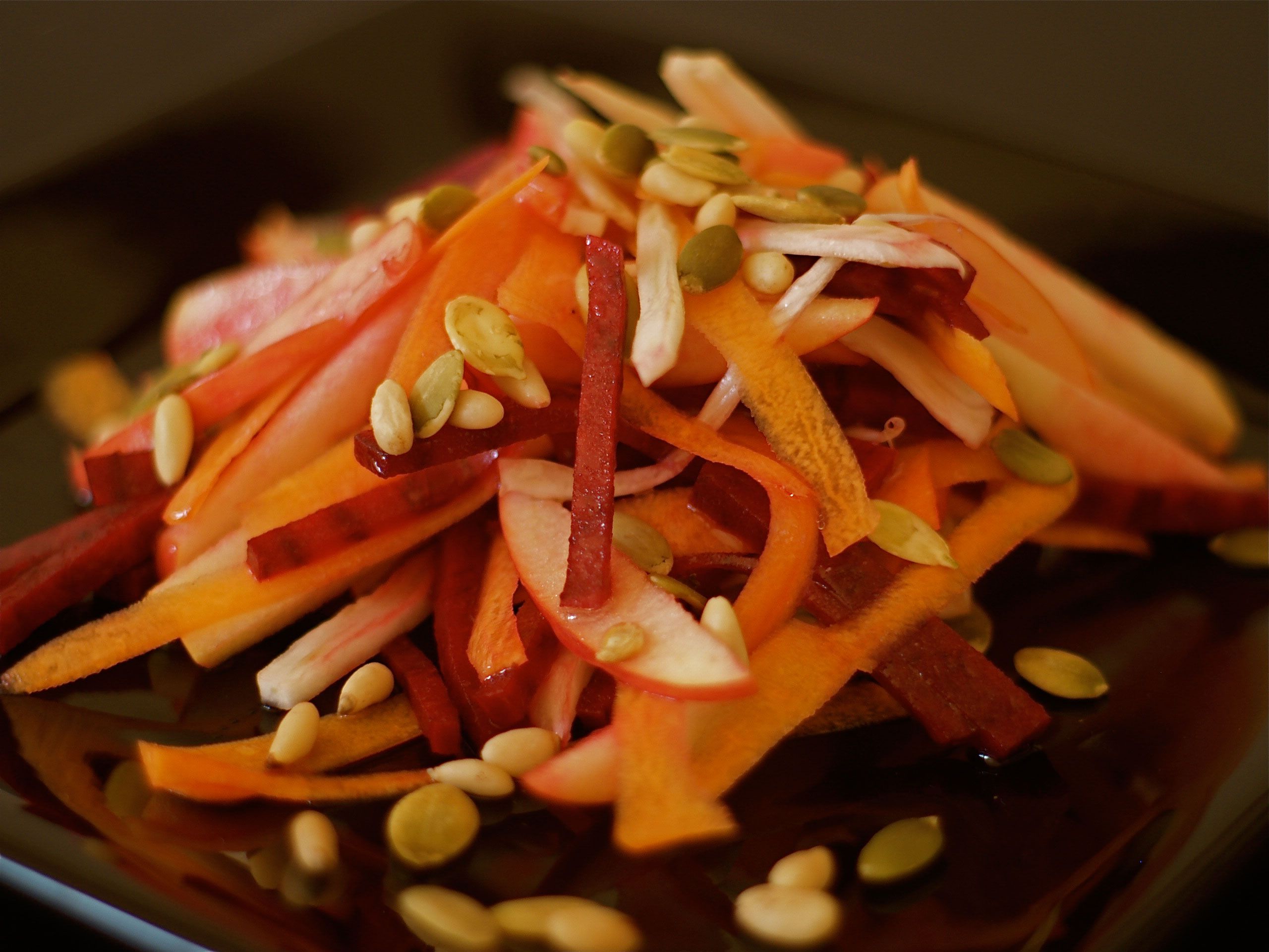 Салат из редьки и свеклы с сыром и орехамиСамый вкусный салатик я оставила напоследок. Натереть свеклу и редьку на крупной терке, добавить тертый пармезан(можно любой твердый сыр, просто я очень люблю пармезан). Измельчить грецкие орехи, все перемешать, добавить немного меда. И совсем немножко оливкового масла. Это не просто салат — это праздник желудка (особенно для вегетарианца!)