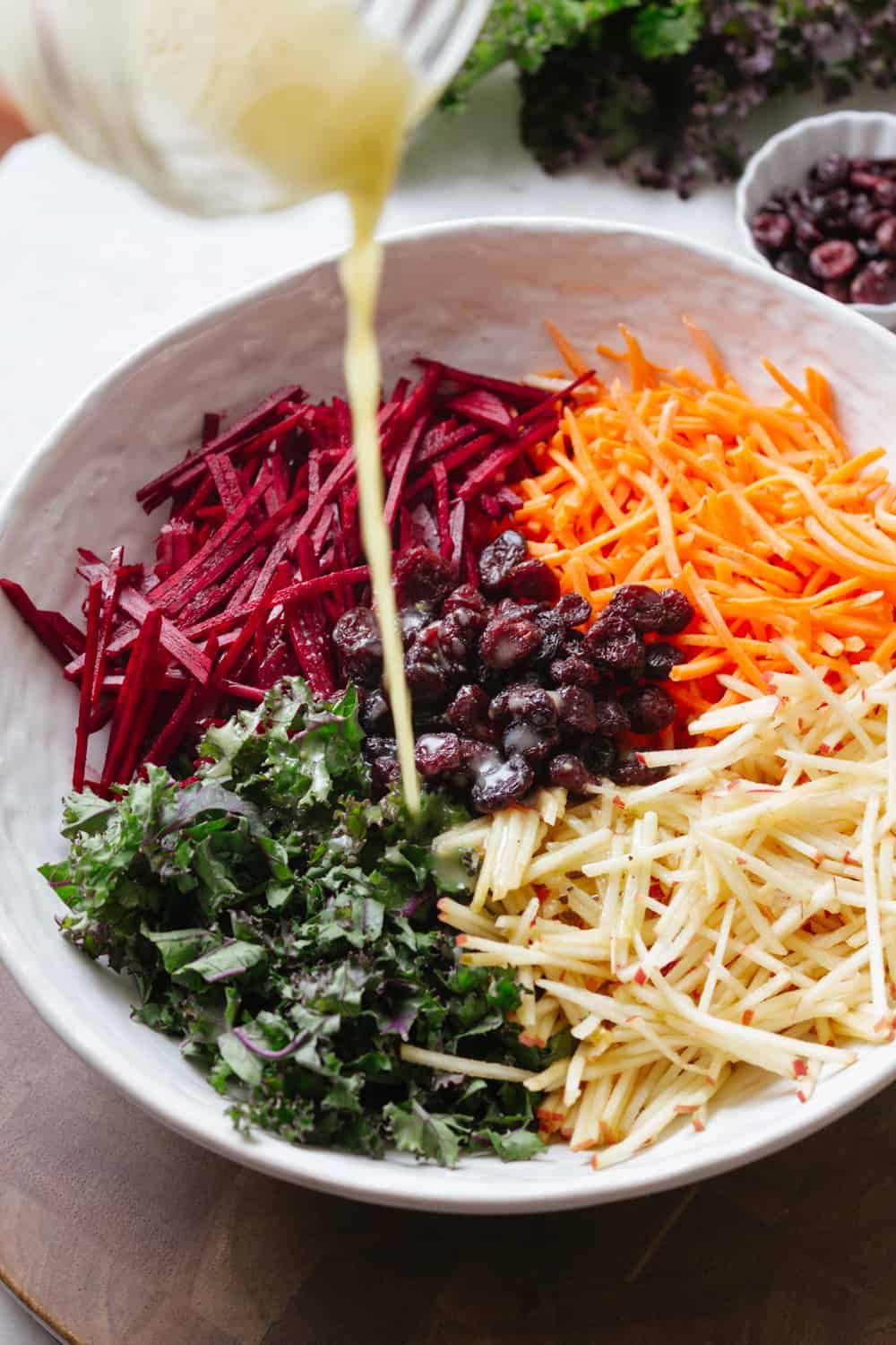 - В большой миске смешайте оливковое масло, лимонный сок, апельсиновый сок и цедру, рисовый уксус, дижонскую горчицу и чеснок; взбить до образования эмульсии. Добавьте сырую свеклу и редис, приправьте солью и перцем и аккуратно перемешайте.