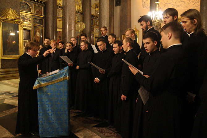 Ну и дирижирование. Даются основные методы дирижирования: гласовое (звуко-высотное) и метрическое. Все показывается, неоднократно. Вы регулярно сдаете в прямом эфире отдельные разделы службы (поете и дирижируете), а затем и целиком. СмОтрите, как это делает преподаватель и коллеги и учитесь, не теоретизируете.