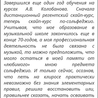 Завершился еще один год обучения на курсах А.В. Колобанова. Сначала дистанционный регентский скайп-курс, теперь скайп-курс по-сольфеджио. Учитывая, что мое образование в музыкальной школе закончилось еще в конце 70-годов, а моя профессиональная деятельность не была связана с музыкой, то можно предположить, что могло остаться в моей памяти от «любимого» мною предмета сольфеджио. И только сейчас, осознав, что петь на клиросе практически невозможно без знания элементарных правил, решила восстановить или, правильнее сказать, начать осваивать с нуля непростой, но интересный и необходимый для регента предмет. Могу долго рассказывать о таланте и профессионализме Алексея Владимировича (наверное, он бы и медведя, которому наступили на ухе, научил бы петь), но хочется выразить ему благодарность за терпение и такт, с которыми он относится к каждому слушателю. Как спокойно и настойчиво на уроках он способствует тому, чтобы любой из нас понял каждую тему, чтобы все эти «секундаккорды» и «терцквартаккорды» выстроились у нас в голове стройными рядами.