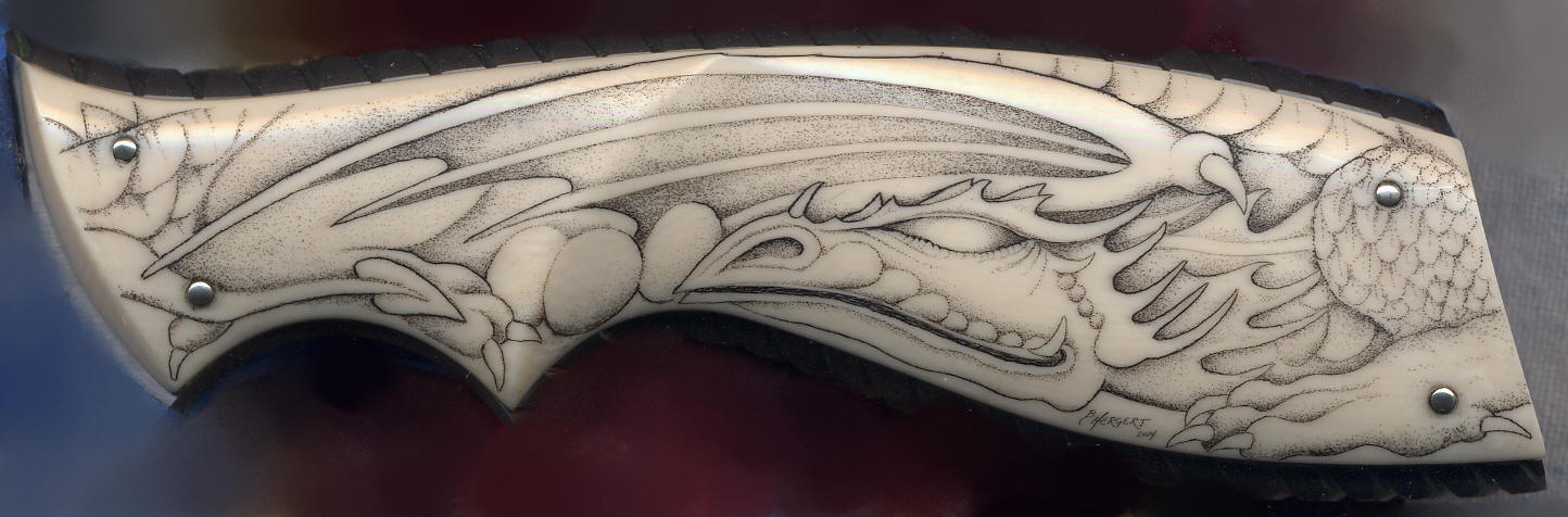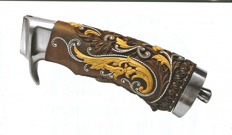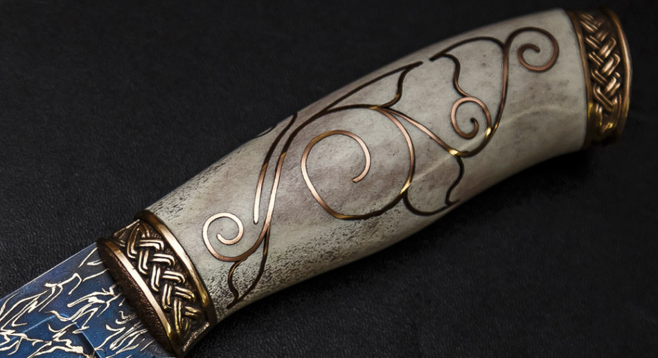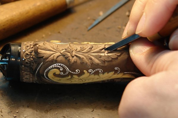 Оба элемента возвышаются над поверхностью приблизительно на 2мм. Эту высоту я оставил для следующей разделки, чтобы они были объёмными. В этой части мастер-класса видно, как рукоять преображается. Сверху и снизу на неё наплывают растительные орнаменты, переплетённые всечкой из серебра и инкрустированными объёмными вставками из самшита. Заднюю часть ручки опоясывает раскладка из одинаковых растительных элементов. Осталось всему этому великолепию придать форму. Этим я и займусь в третьей части своего мастер-класса.