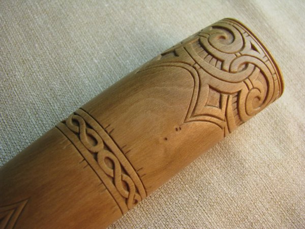 Закончив с плоскорельефной резьбой, начинаю накладывать фаску на всечку, которая в процессе переплетения с резьбой имеет нечёткие края.