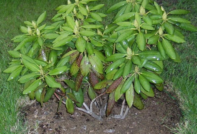 Гриб Phytophthora вызывает одну из наиболее распространенных болезней в ландшафте рододендронов и азалий. Этот грибок представляет собой «водяную плесень» и процветает в плохо дренированных или влажных условиях. Увядшее растение обычно является первым признаком неприятностей. Листья рододендрона скручиваются внутрь и поникают. Засуха может вызвать аналогичные симптомы. Корни пораженных растений кажутся влажными или почерневшими, а внешняя часть корня легко отделяется от внутренней части.
