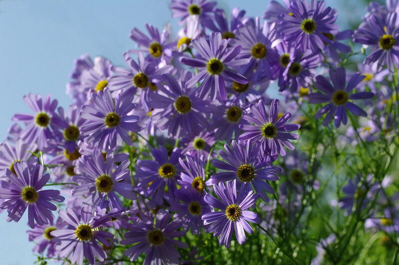 Для фелиции характерен редкий синеватый оттенок, из-за такой особенности является частым гостем в ландшафтных композициях и бордюрных решениях, серединка же у цветков неизменно имеет легкий желтоватый окрас. Фелиция устойчива к холодам, но требовательна к влаге и солнечному света, недостаточный полив, засухи, неправильно подобранное слишком затемнённое место посадки могут погубить растение. Низкорослые кустики разрастаются в длину до полуметра, давая при этом обильный «урожай» маленьких милых бутонов.