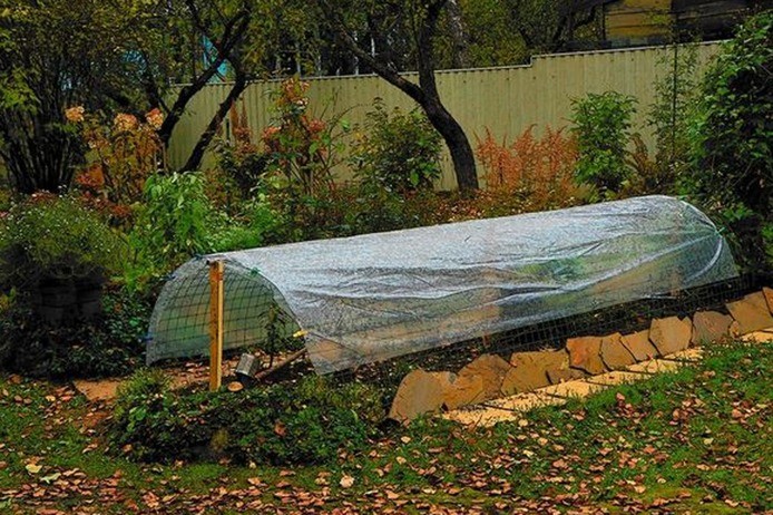 При установке несущих рам вместо проволоки лучше использовать пластиковые трубки, что исключает травмы и обмерзание побегов в местах соприкосновения. Учитывайте несущую конструкцию, чтобы избежать провисания укрывного материала — таким образом вы обеспечите гарантированный отвод лишней осенней воды и талой родниковой воды. Иногда над насаждениями осенью устанавливают временную крышу из пленки, которую снимают перед окончательным укрытием.