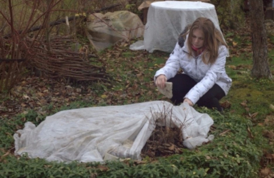 Непосредственно перед укрытием все верхние побеги засыпают сухой опавшей листвой и сверху укрывают еловым лапником. Затем приступают к сооружению воздушного укрытия.