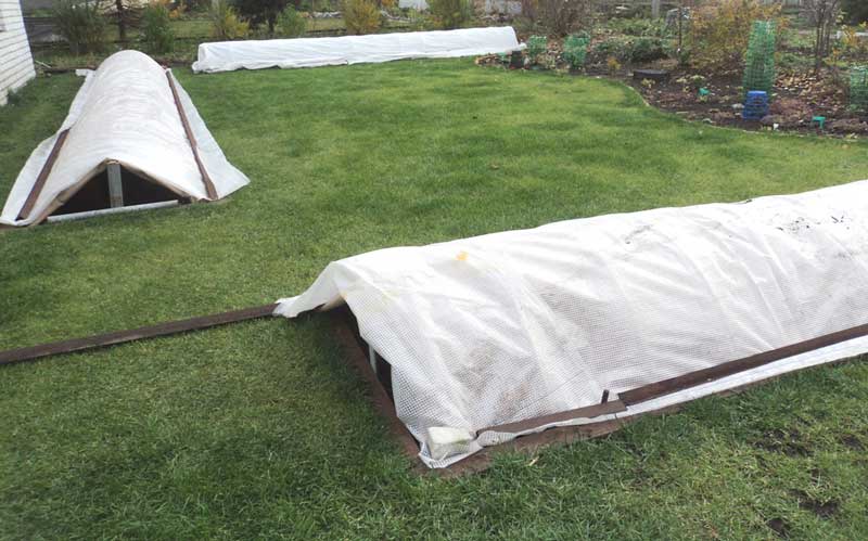 Теперь собственно укрытие. Воздушно-сухое укрытие по классическому типу, с использованием каркасов, рубероида или пленки, мешковины — проводят с наступлением холодов, обычно в начале ноября. Желательно, конечно, успеть до снега.