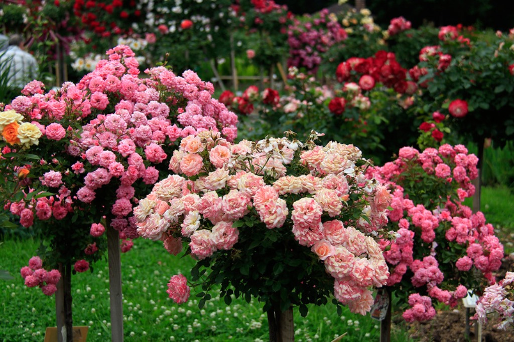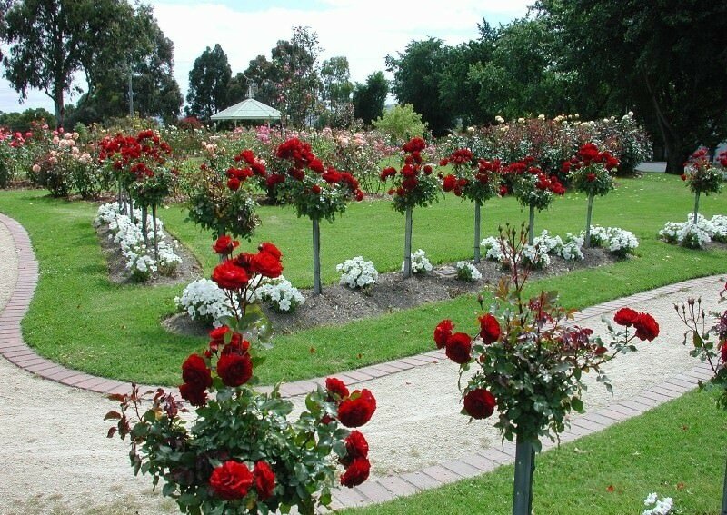 Розарии могут быть сформированы абсолютно в разных стилях. Их высаживают либо преимущественно розовыми кустами, либо дополняют другими растениями. Сейчас дизайнеры украшают такие места различными архитектурными формами. А вьющиеся сорта роз располагают на разнообразных опорах или же фигурных колоннах.