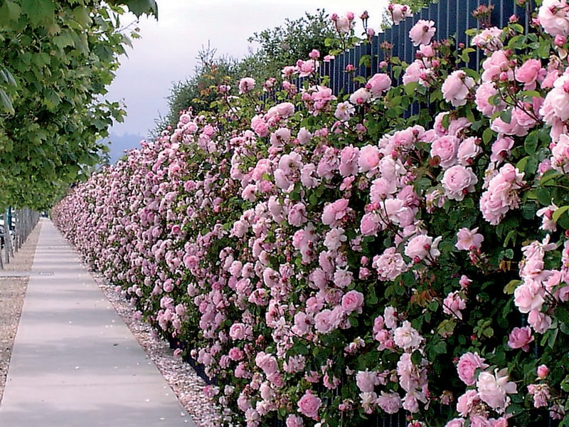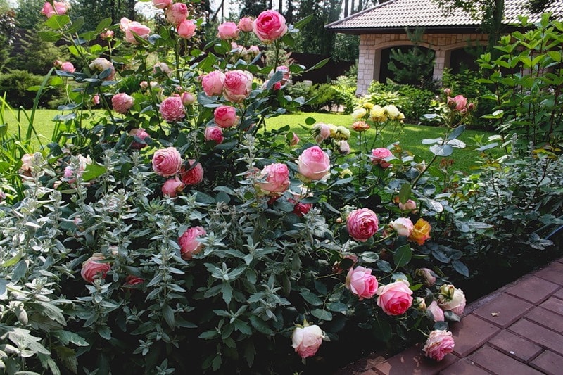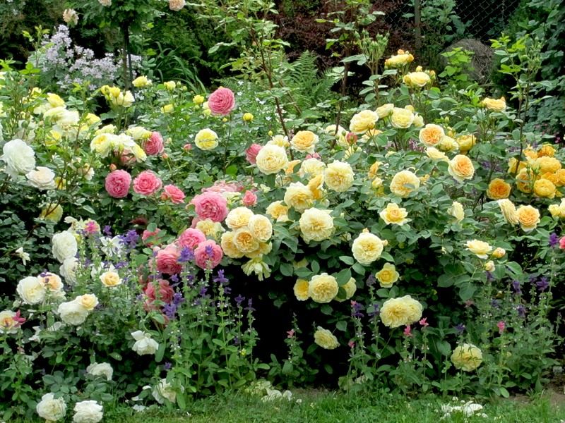 Такой розарий предполагает высаживание не только розовых кустов, но и других растений. У многих садоводов мнения по этому поводу расходятся, так как некоторые считают, что не стоит смешивать розы с другими цветами. Хотя практика показывает изумительный результат. Розы неплохо доминируют с другими разновидностями растений. Особо сочетаются с розами хвойные насаждения, такие как ели, можжевельники и туи. Кроме того, изысканность придают барбарисы, ирисы, лилейники. Если все высадить правильно, то композиция будет иметь прекрасный романтичный вид.