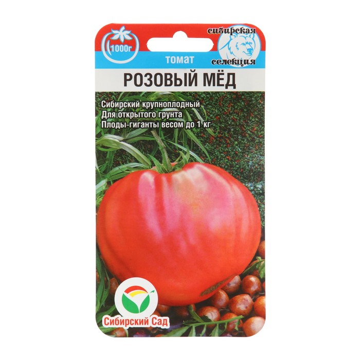 Растения устойчивые и нетребовательные. Плоды розовые, круглые, вкусные, с небольшой кислинкой, с отличными товарными качествами. Масса плодов примерно 200 г, некоторые достигают 250-300 г. Кусты компактные, высотой до 60 см. Розовый мед – это штамбовый сорт среднего срока созревания, высокоурожайный — кусты увешаны плодами. Цена семян невысокая.