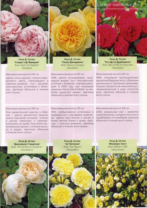 Следует отметить, что для всех перечисленных в таблице сортов, кроме Щедрого Садовника (The Generous Gardener), указанная высота куста достигается при выращивании шрабом. Однако практика показывает, что при ведении плетью эти сорта способны вырастать до 2,5 и даже до 3 метров.